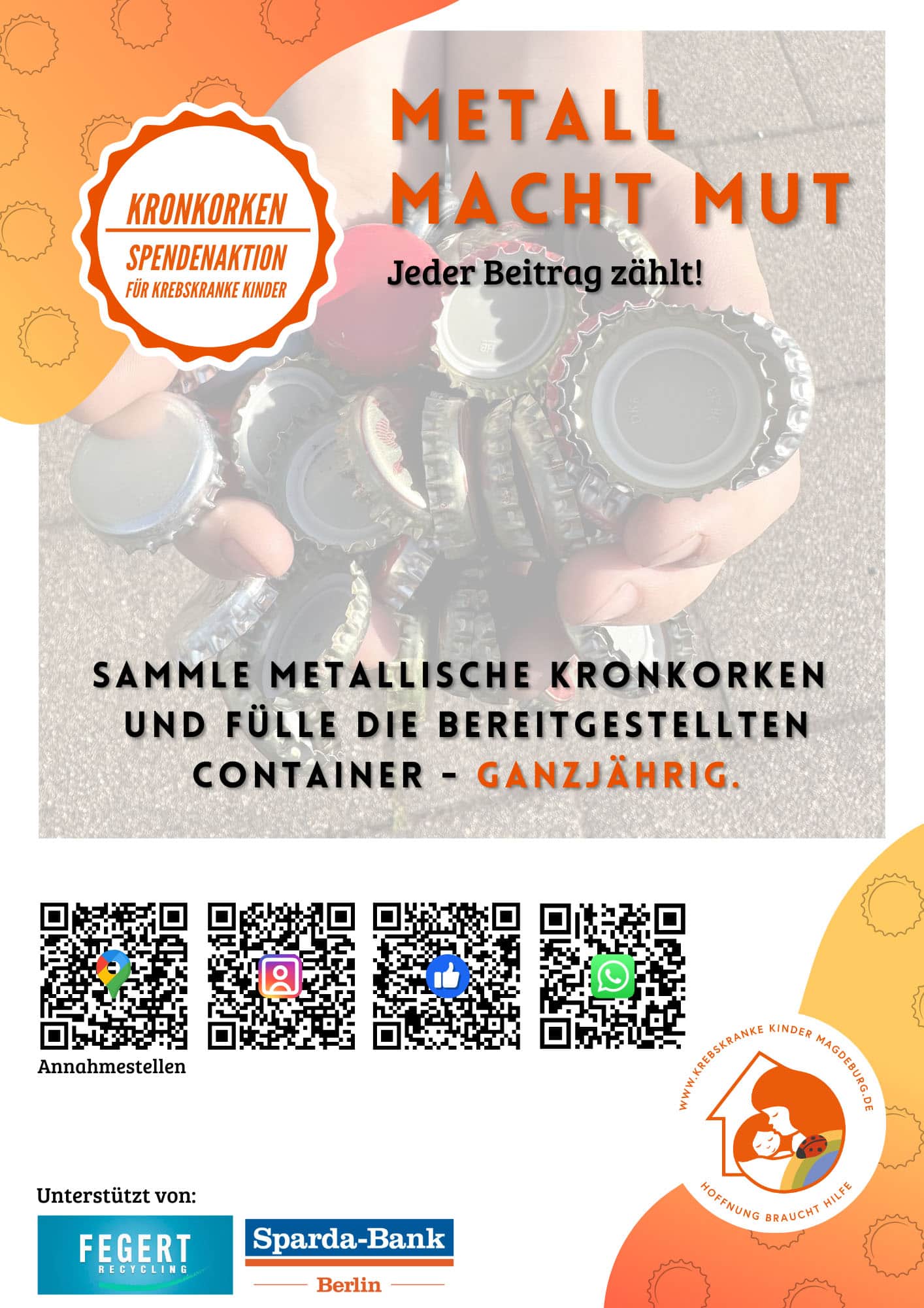 Unsere Kronkorken-Spendenaktion in Magdeburg und Umgebung: Sammle metallische Kronkorken und fülle unsere bereitgestellten Container.